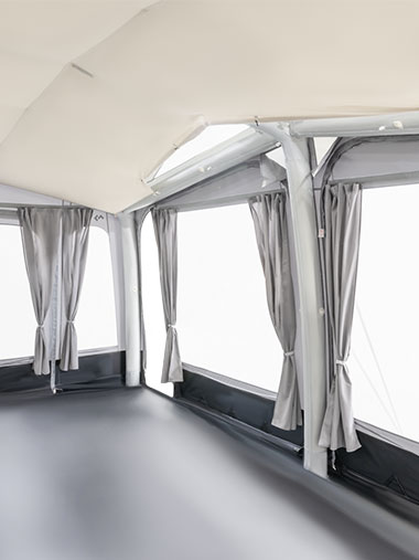 Das Vorzelt Dometic Residence Tour nutzt wie alle Residence-Modelle die Gesamtlänge der Wohnwagen-Vorzeltschiene. Aber wir haben das strapazierfähige Polycotton gegen UV-beständiges Ripstop-Polyester ausgetauscht, die Fenster neu gestaltet und auch unser neues 3-seitiges Vordach eingeführt. Ein atmungsaktiver Innenhimmel und eine wasserfeste Bodenplane gehören zur Standardausstattung.